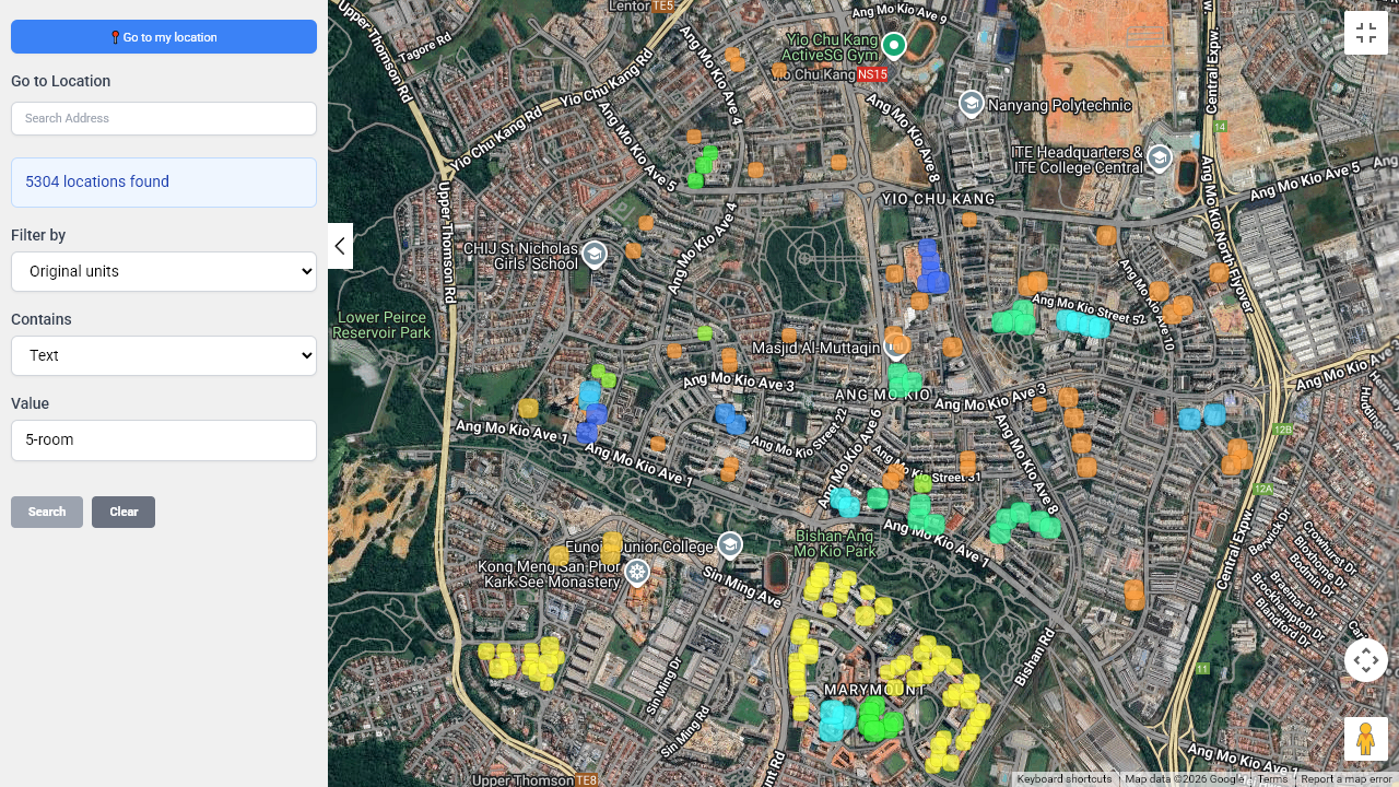 Contains: type 1-room, 2-room, 3-room, 4-room, 5-room, executive, studio, etc, to see blocks having a particular flat type. Choose original units to exclude 5-room and Executive formed by adjoining 3-room and smaller flats, or current units to exclude them.